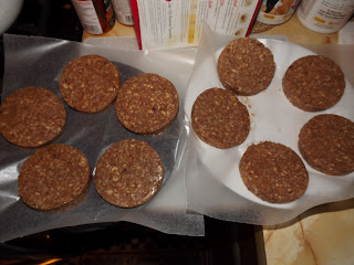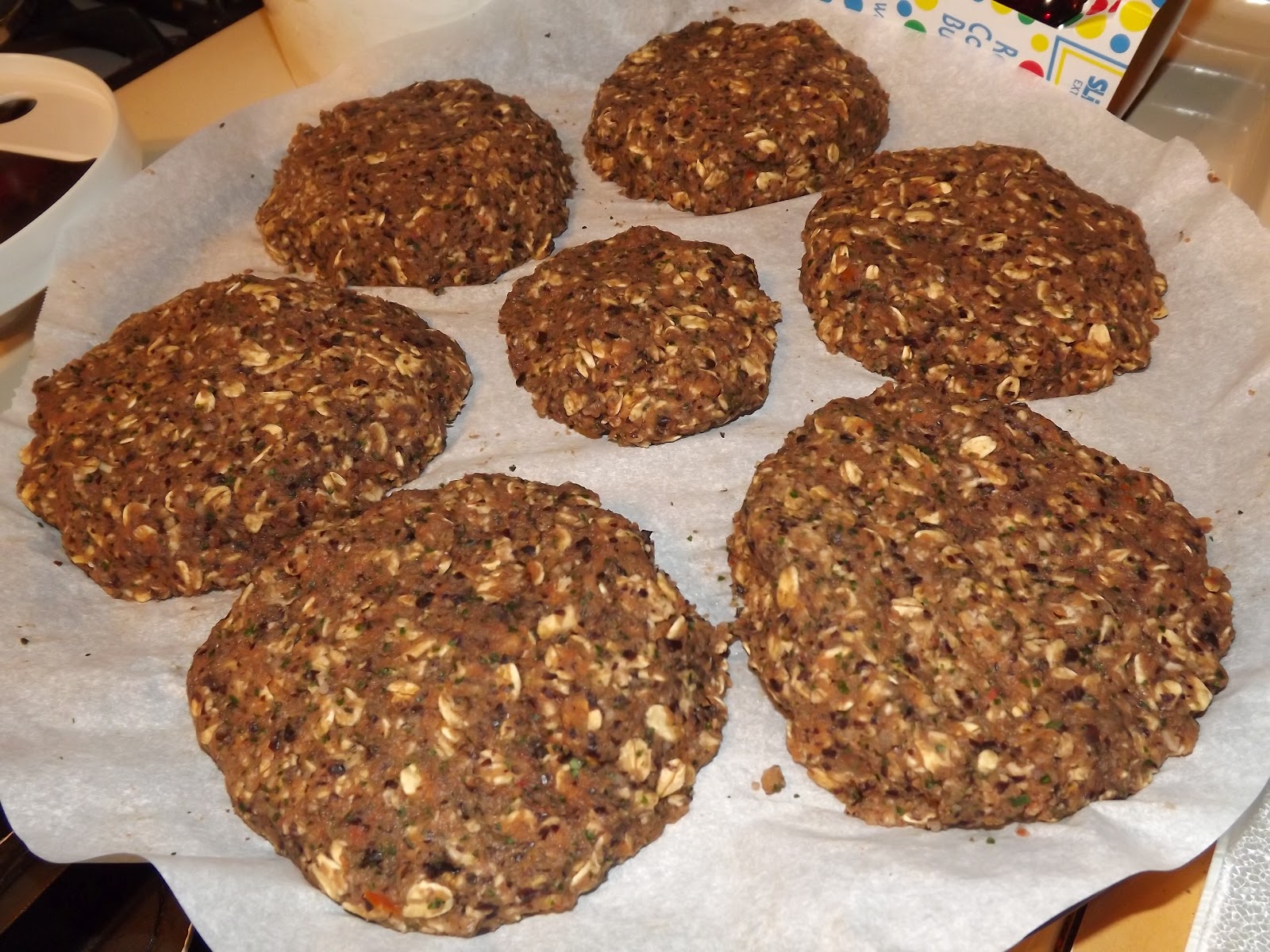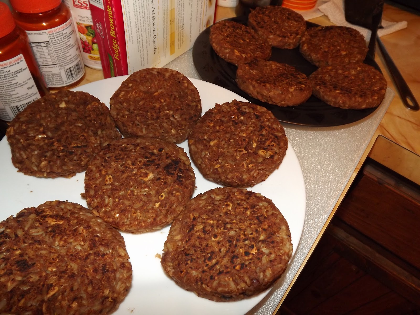 Vegan Patties Like You've Never Had in late August. These are made with nuts, refried beans, and oatmeal. I made the burger mixture on one day, threw it into the refrigerator overnight, and then formed the burgers the next day. The mixture was very sticky and soft the first day, so the overnight refrigeration was perfect. I pan fried them for 5 minutes on each side, but they were still very soft burgers, so I ended up baking them at 350º for about 20 minutes. That helped, but I ended up putting them back into the oven (it had been turned off for 15 or 20 minutes and had cooled down a lot) and just let them sit in there for another 20 minutes or so.