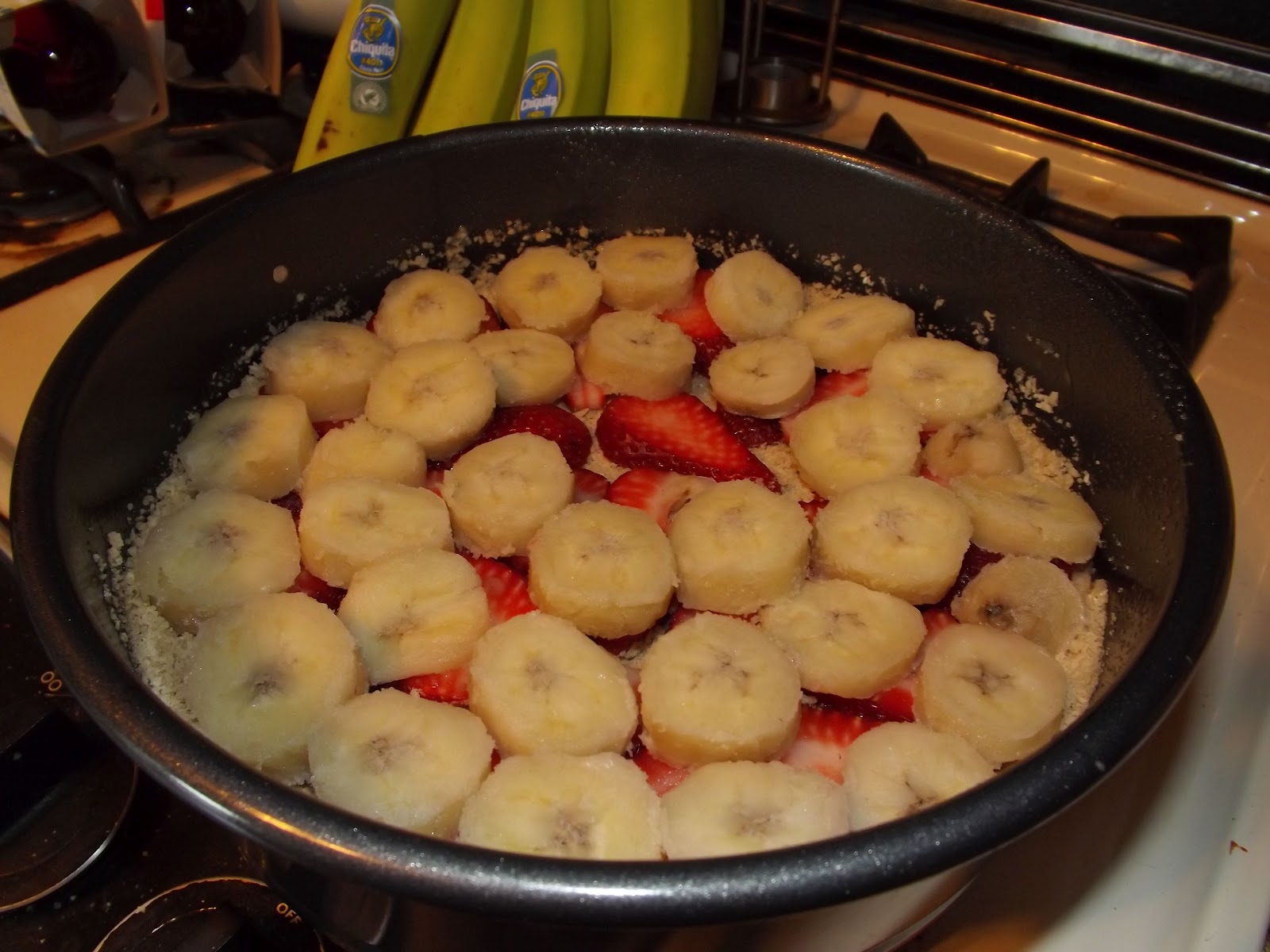 Banana Crumble (recipe at the bottom of the webpage). I added sliced fresh strawberries to it. It would have been good with half or even a third of the crust listed in the recipe. There was WAY TOO MUCH crust on this and not enough fruit/filling.