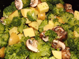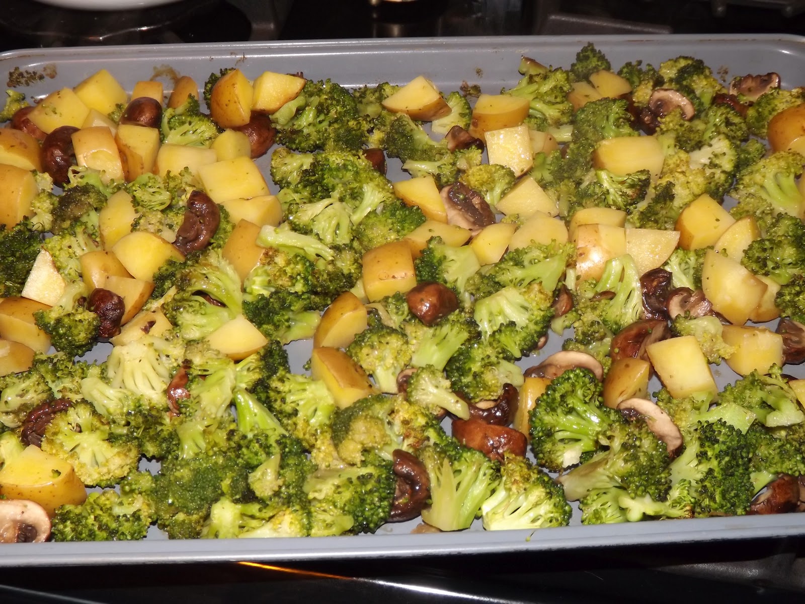 Tonight, I roasted broccoli, Yukon God potatoes, and baby bella mushrooms in a splash of olive oil, French gray sea salt, and pepper. OMG! I love roasted veggies and could have eaten the entire pan of them. I tried to restrain myself and I saved a generous portion for tomorrow.