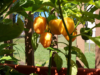 It's been a month since I blogged. WOW! And that month has gone by quickly. I took a vacation in Wisconsin for a week and have been tending to my deck garden. OK, that's not exactly true. My oldest son has been tending to my deck garden. And he has done an excellent job! My hot lemon peppers are turning yellow, my habanero peppers are turning orange, my Big Boy tomatoes are ripening, and I harvested a bunch of jalapeno peppers and the lone yellow bell pepper that my plant produced.